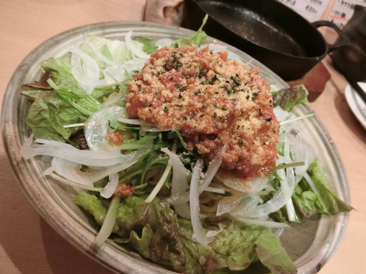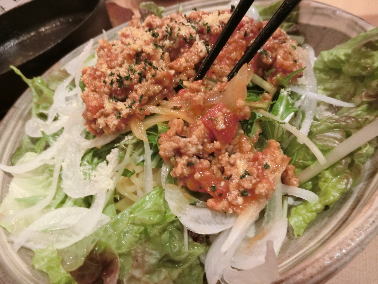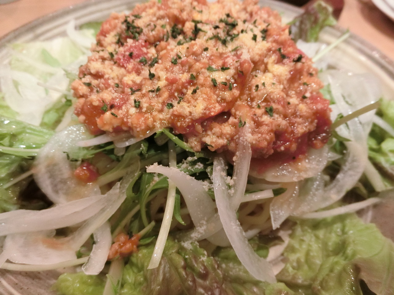 生野菜とタコスミートと麺のコラボがすばらしい。