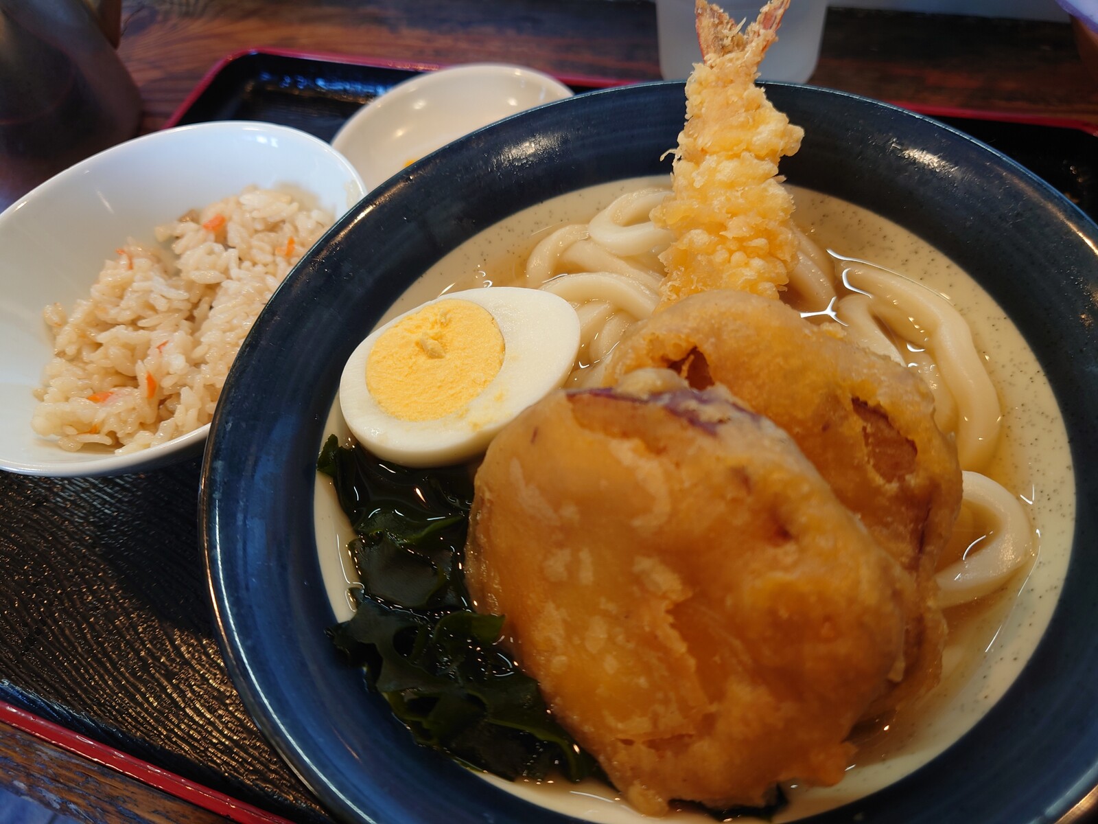 うどんは少な目 具は数種(本来はゆで卵・ワカメ・肉・海老天)